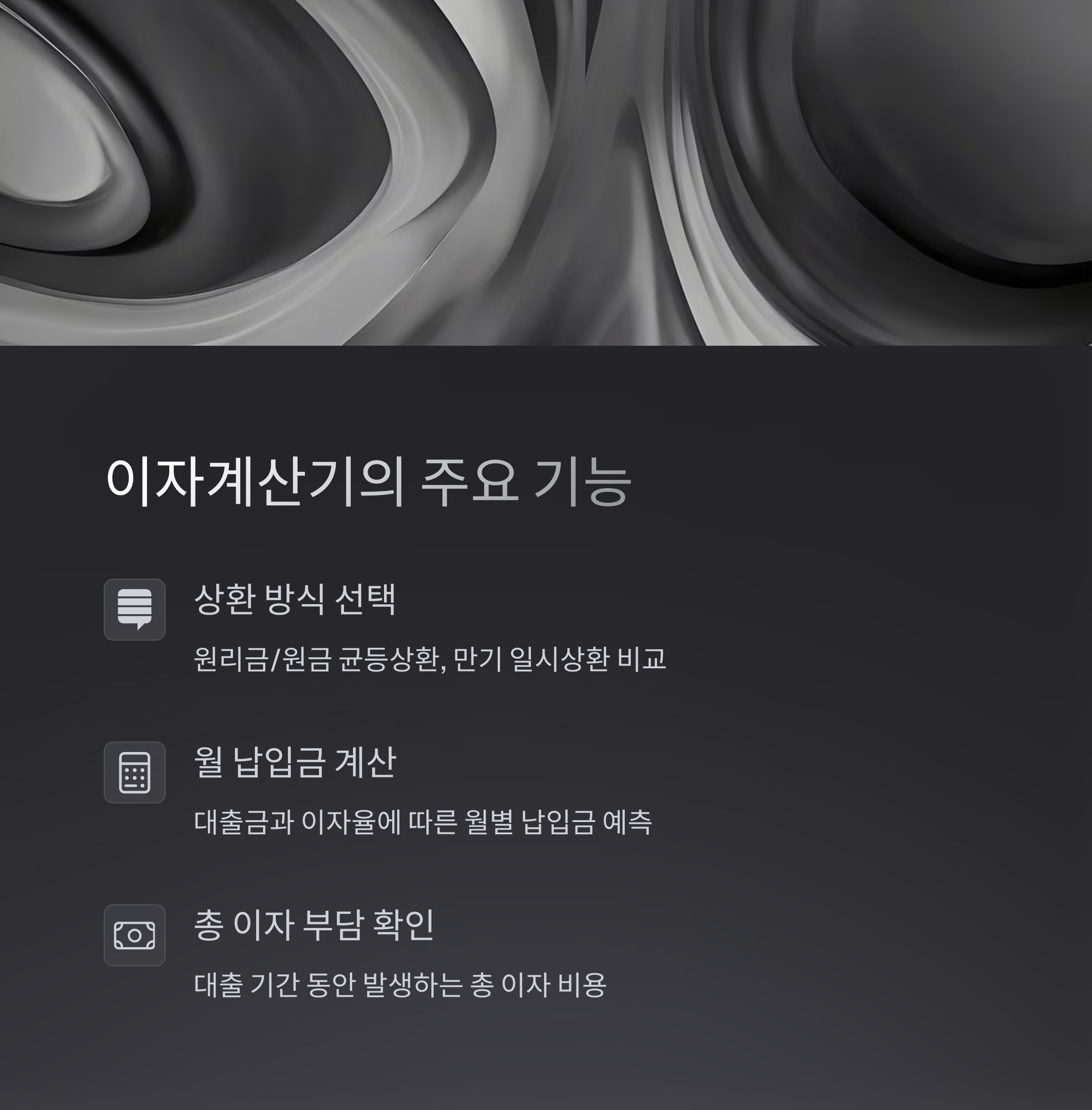 주택담보대출 이자계산기를 활용하면 대출 조건을 쉽게 비교하고, 가장 적합한 대출 방식을 선택할 수 있습니다. 지금 바로 이자계산기를 활용하여 당신에게 가장 유리한 대출 계획을 세워보세요!