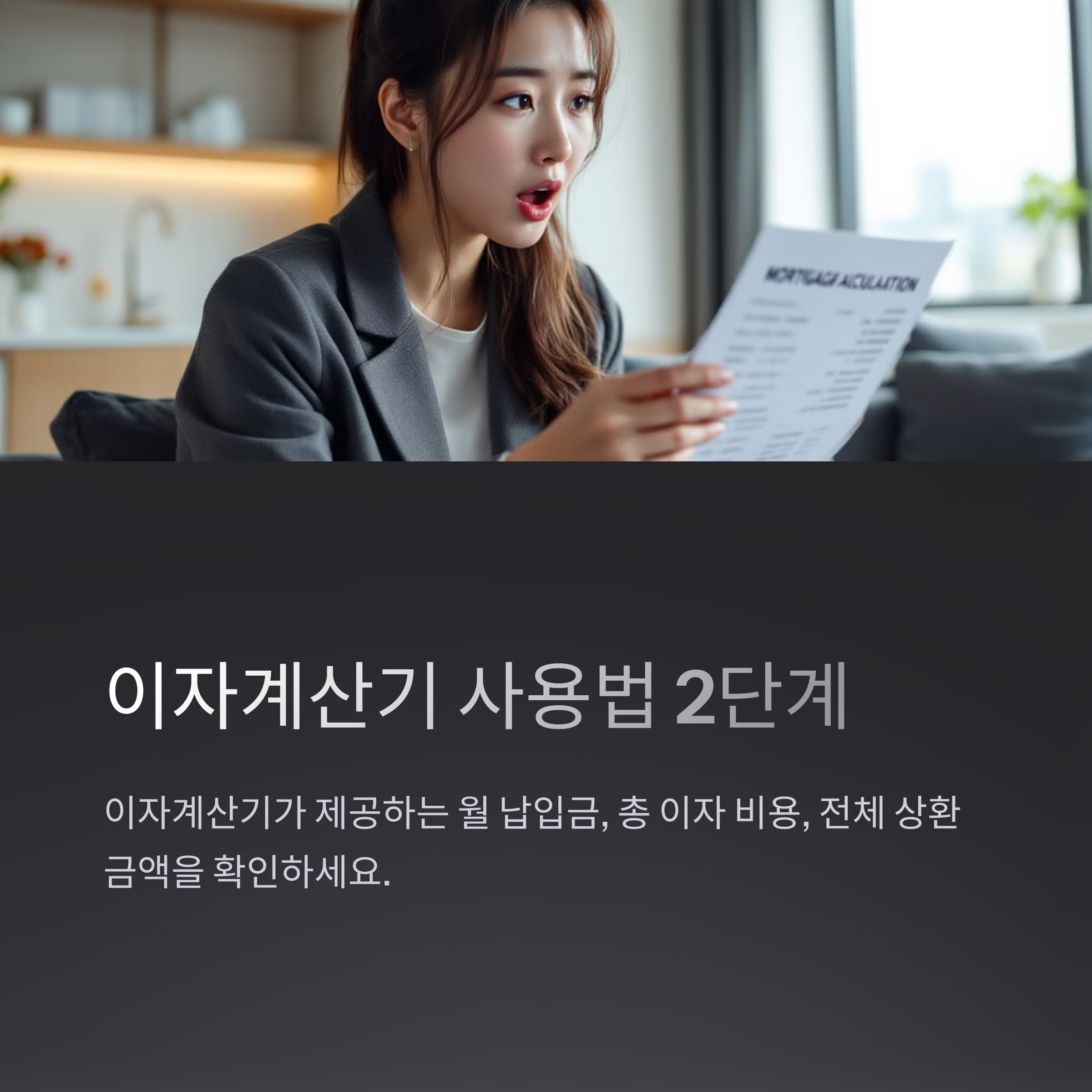 이자계산기가 제공하는 데이터를 확인하여 월 납입금, 총 이자 비용, 전체 상환 금액을 파악합니다.