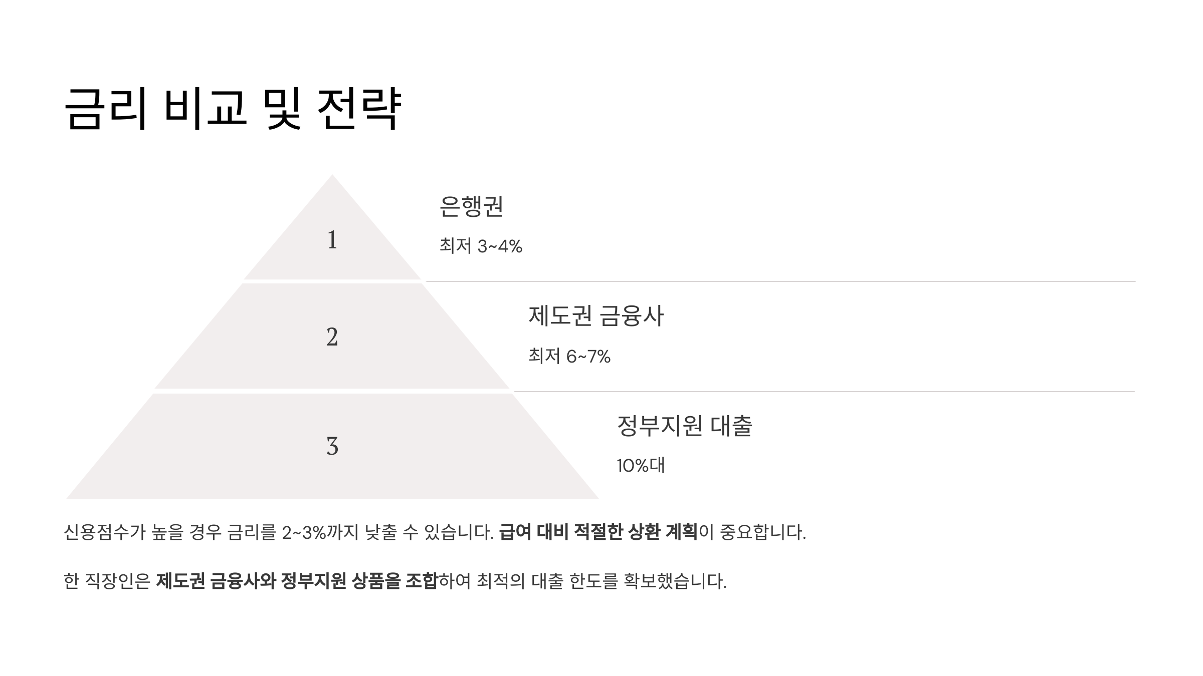 신용점수가 높을 경우 금리를 2~3%까지 낮출 수도 있으며, 급여 대비 적절한 상환 계획을 세우는 것이 중요합니다.