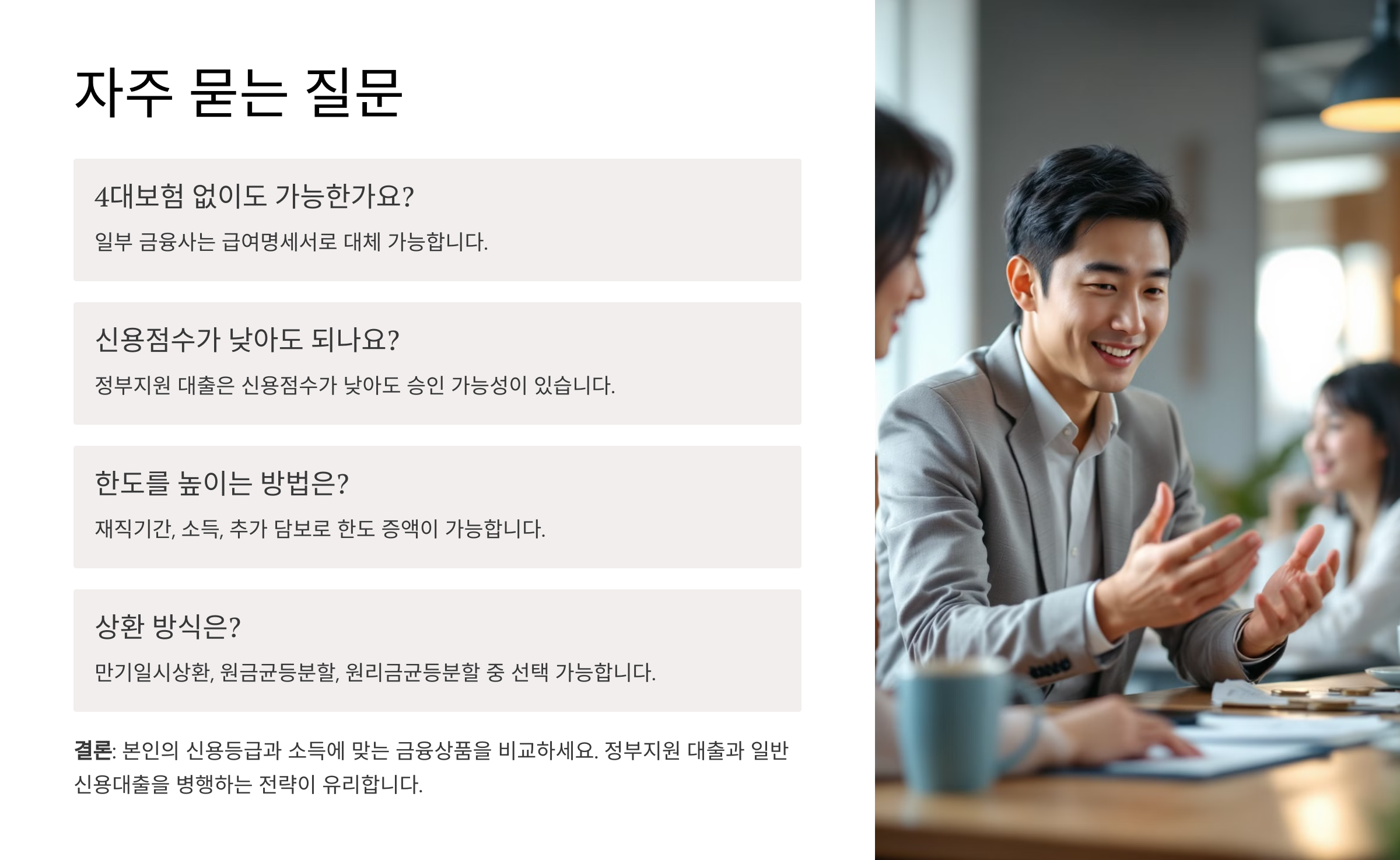 A1. 일반적으로 4대보험 가입이 필수지만, 일부 금융사에서는 건강보험 납부 내역이 없어도 급여 명세서를 통한 대출이 가능합니다.
