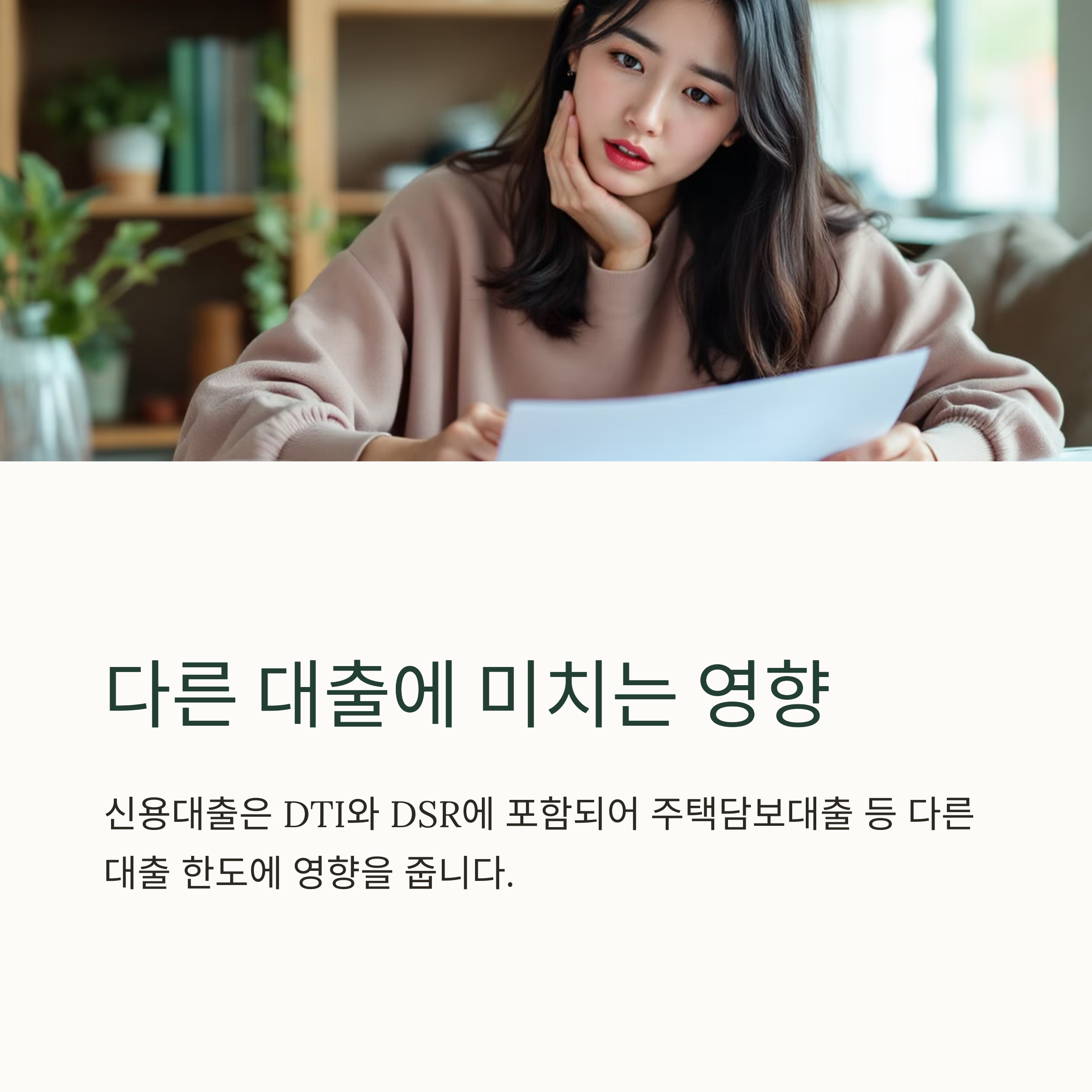 A. 신용대출을 받으면 DTI(총부채상환비율), DSR(총부채원리금상환비율)에 포함되어 다른 대출 한도에 영향을 줄 수 있습니다.