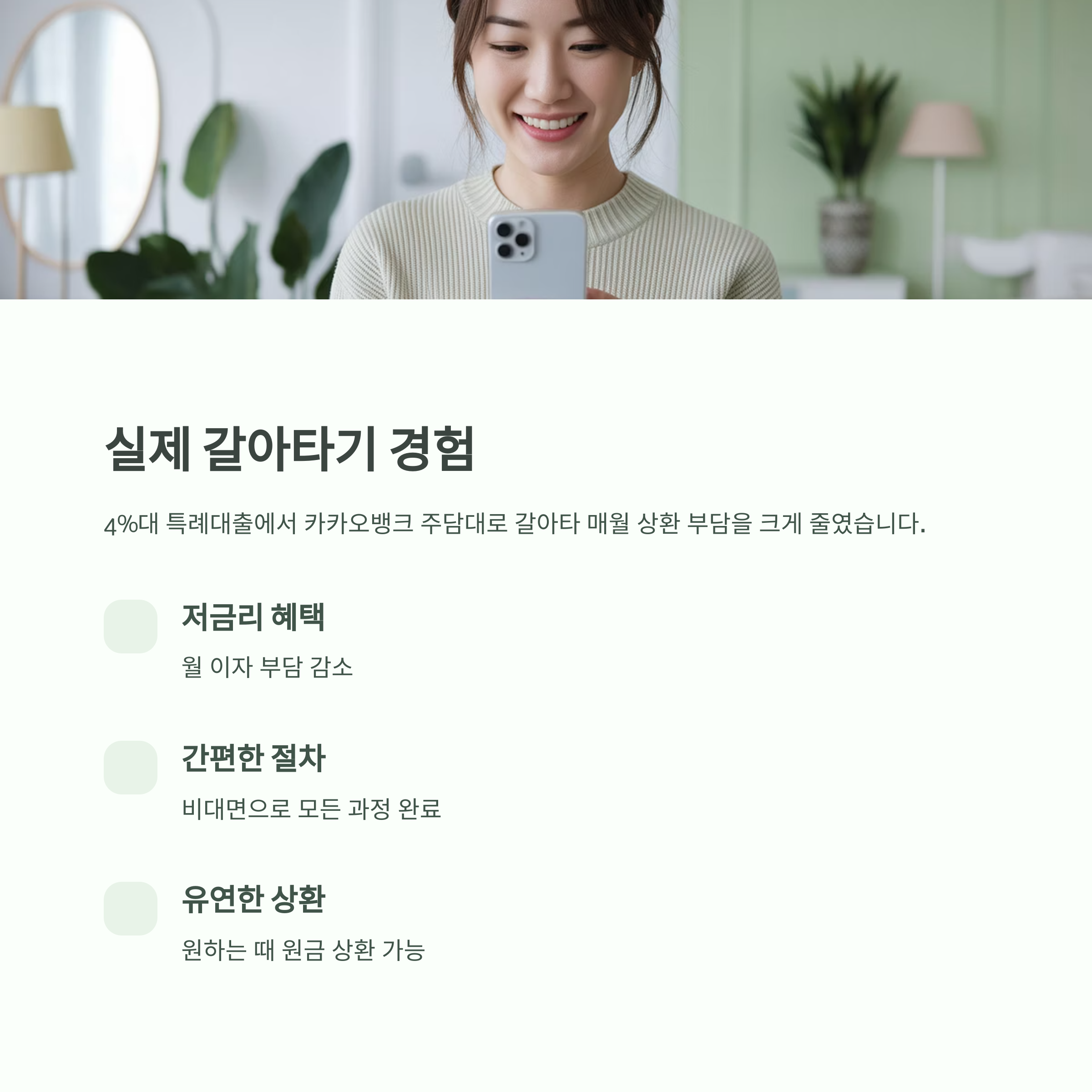 금리가 높은 기존 주담대, 부담되시죠? 2025년 현재, 시중은행 대비 인터넷은행 주택담보대출의 금리 경쟁력이 두드러지면서 많은 분들이 카카오뱅크 대환대출을 고려하고 있습니다. 저금리, 비대면 절차, 유연한 대출 조건 덕분에 많은 만족을 얻을 수 있었죠. 오늘은 제가 실제로 갈아탄 경험을 바탕으로 카카오뱅크 주택담보대출의 조건, 한도, 신청 절차, 서류까지 꼼꼼히 정리해드릴게요.