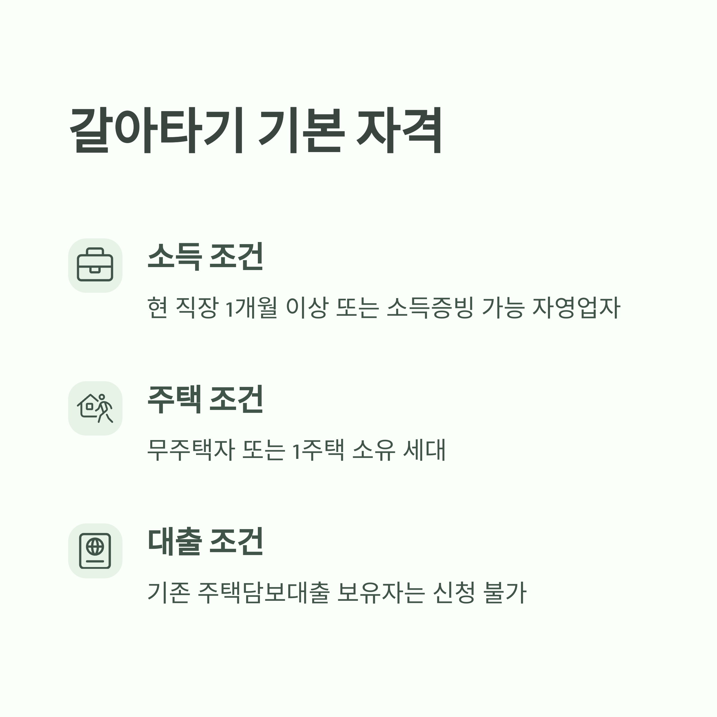 - 무주택자 또는 1주택 소유 세대 (1주택자는 기존 주택 처분 예정 조건 포함)