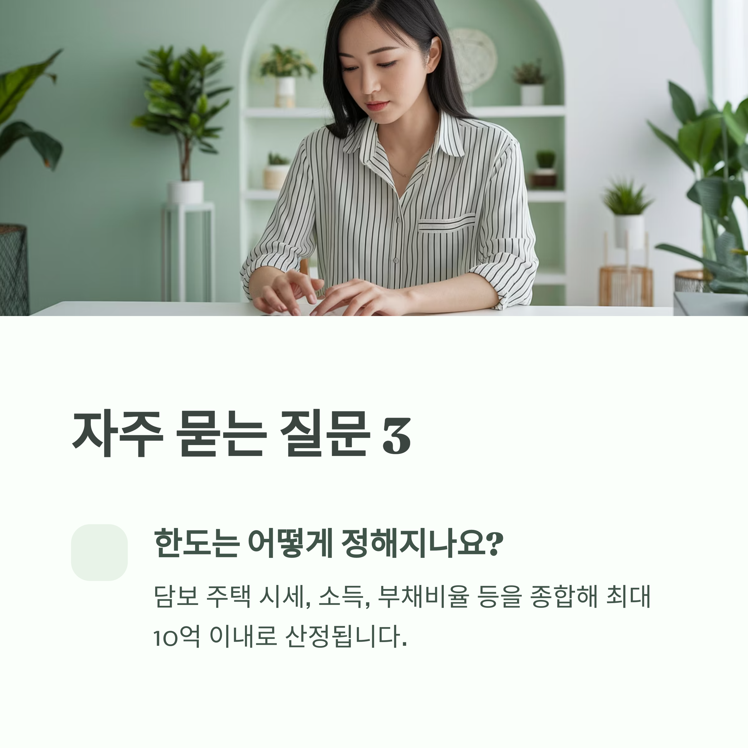A5. 담보 주택의 시세, 신청자의 소득, 부채비율 등을 종합해 산정되며, 최대 10억 이내입니다.