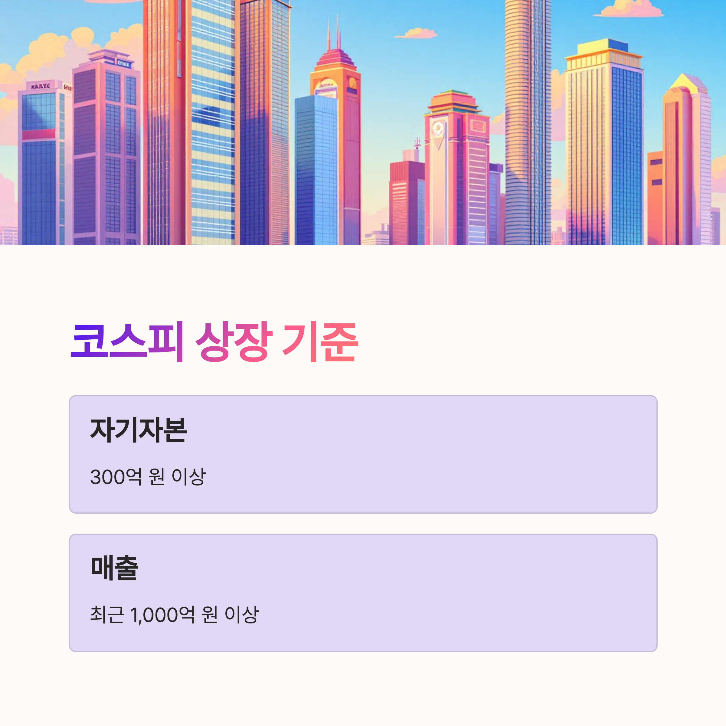 | 상장 기준 | 자기자본 300억 원 이상, 매출 1,000억 원 이상 | 자기자본 30억 원 이상, 매출 50억 원 이상 |