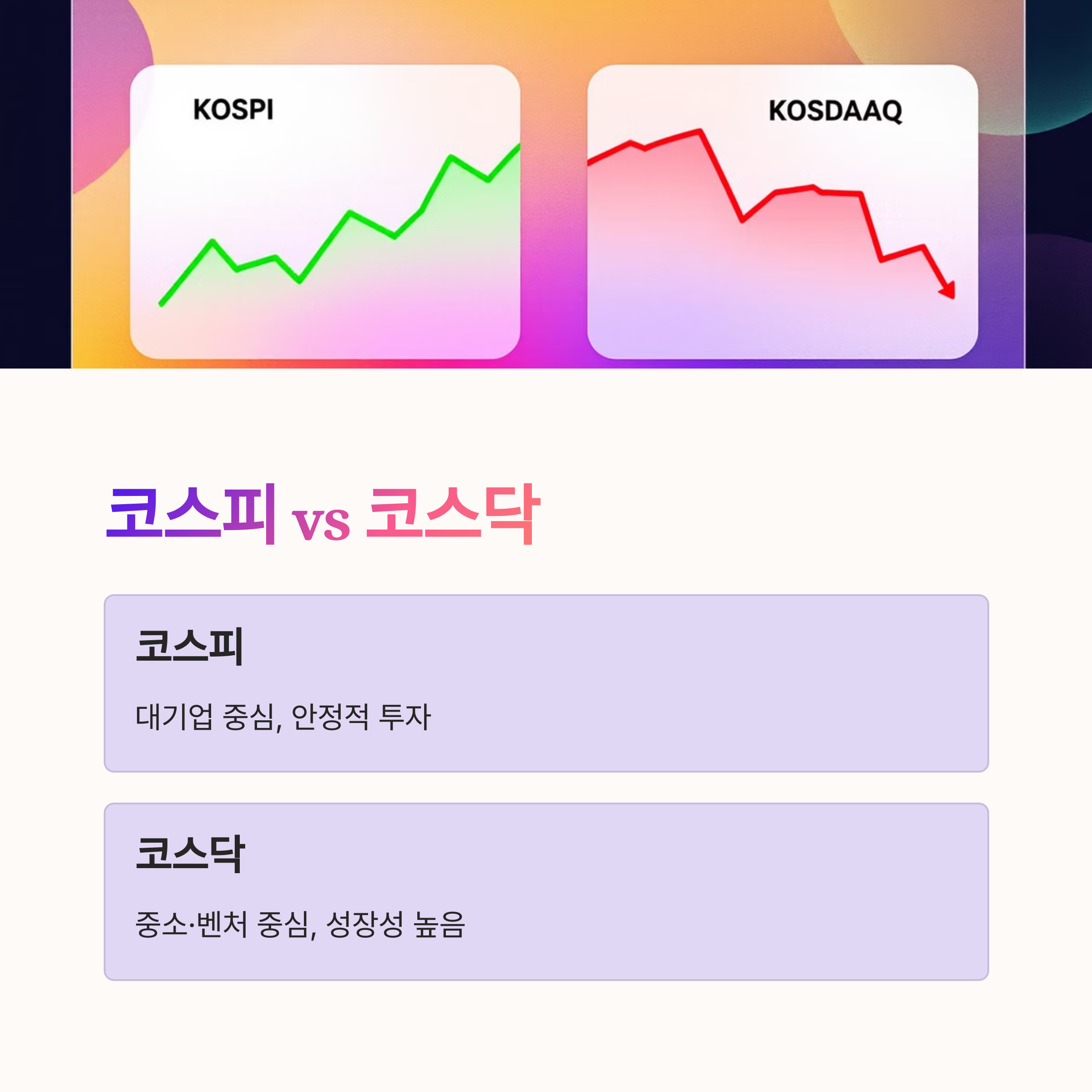 A1. 코스피는 대형·중견기업 중심의 안정적인 시장이고, 코스닥은 중소·벤처기업 중심의 성장성이 높은 시장입니다.