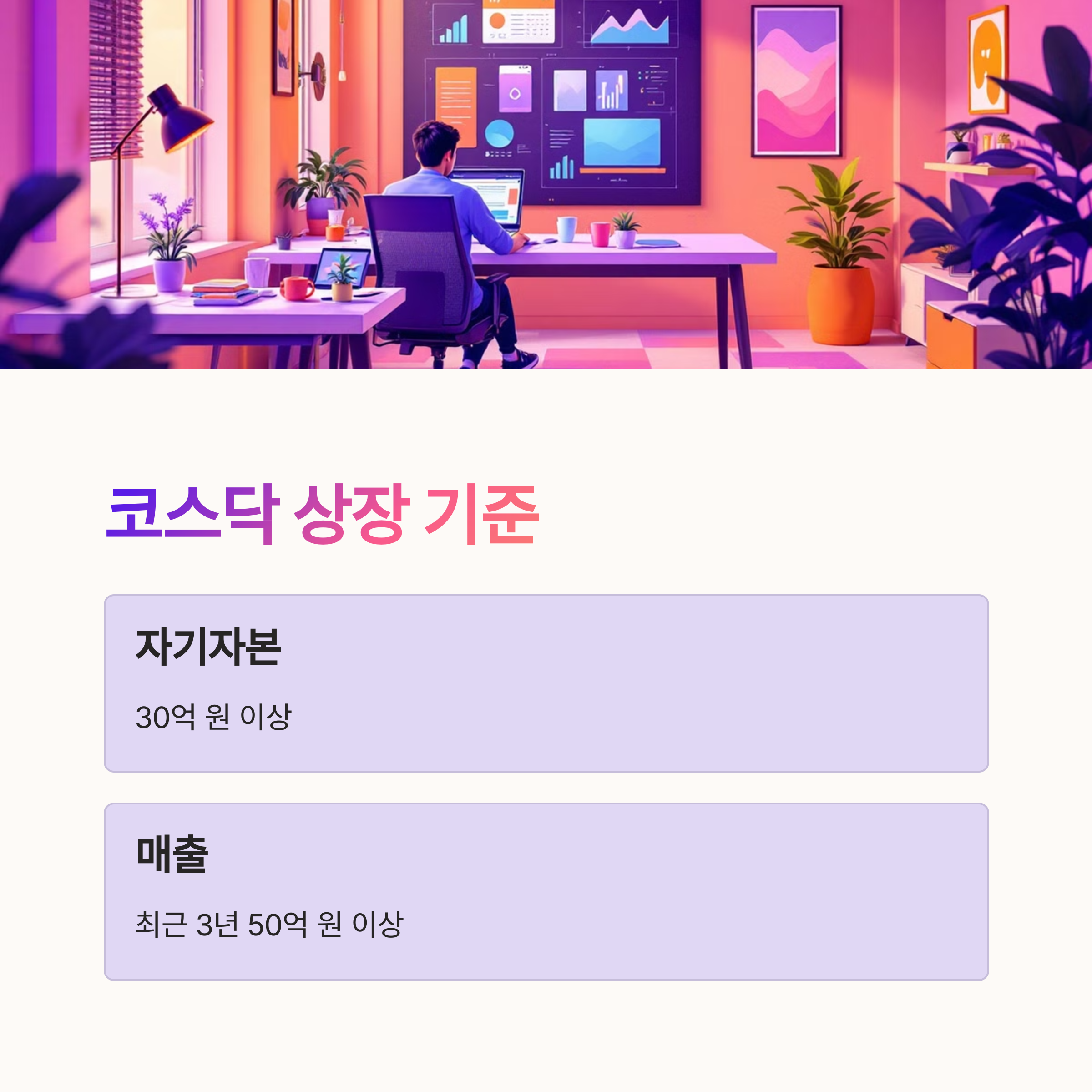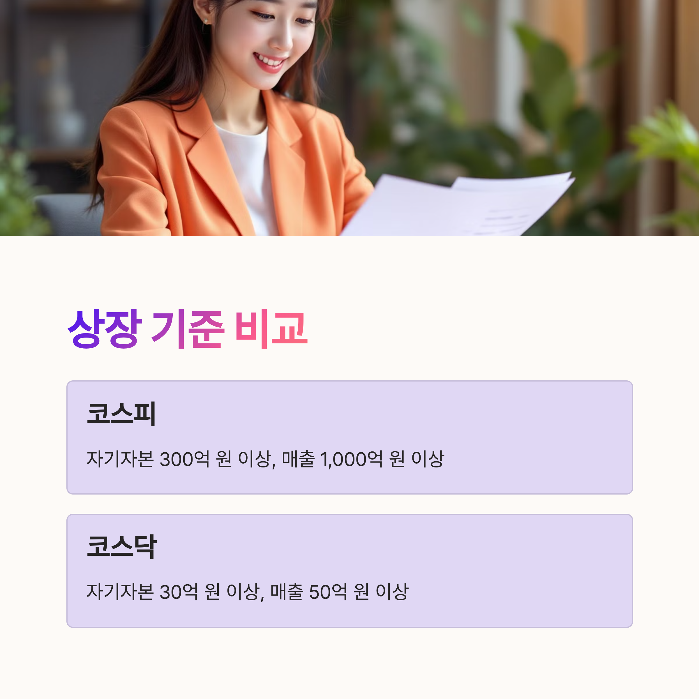 - 상장 기준이 상대적으로 완화됨 (자기자본 30억 원 이상, 최근 3년 매출 50억 원 이상)