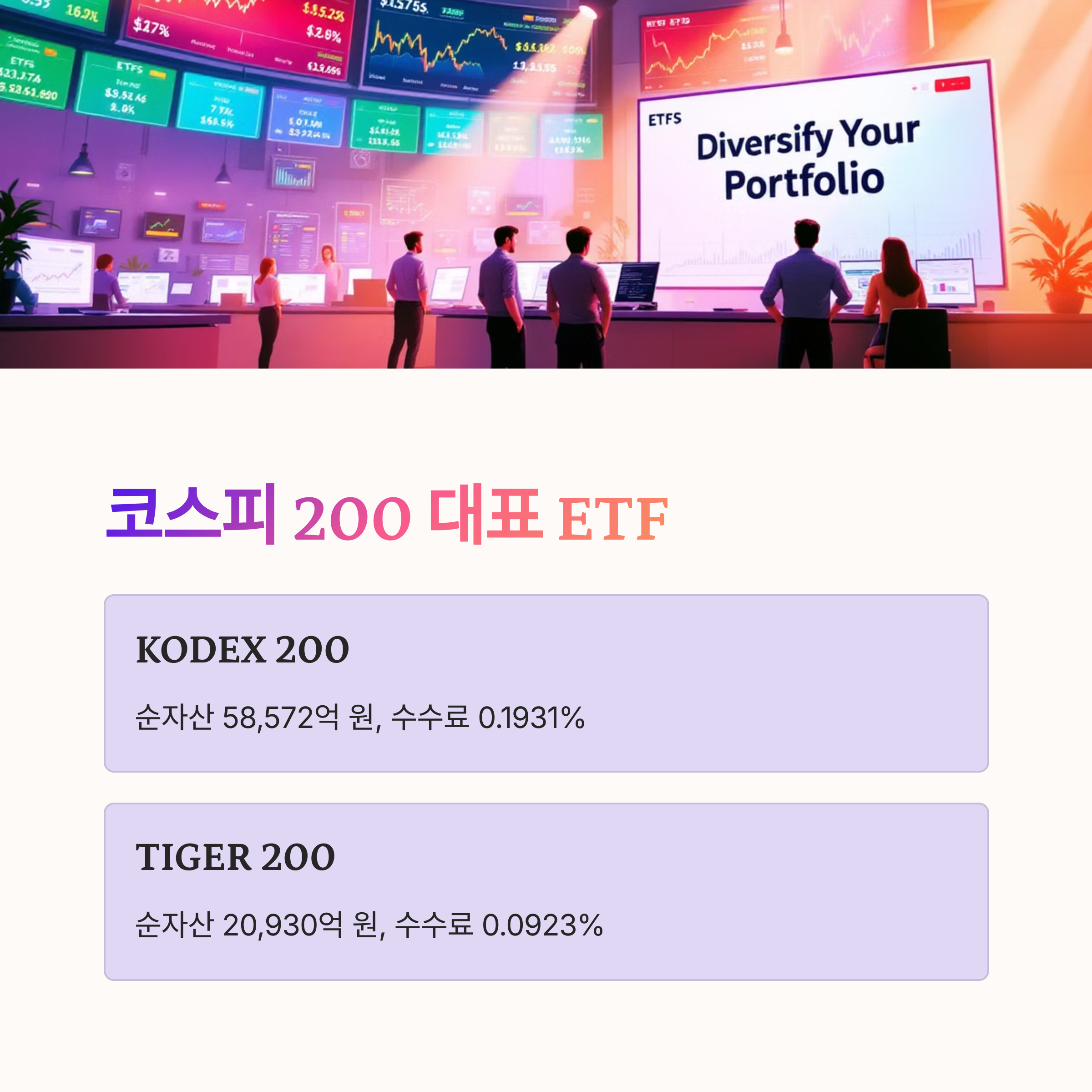 - KODEX 200: 순자산 58,572억 원, 수수료 0.1931%