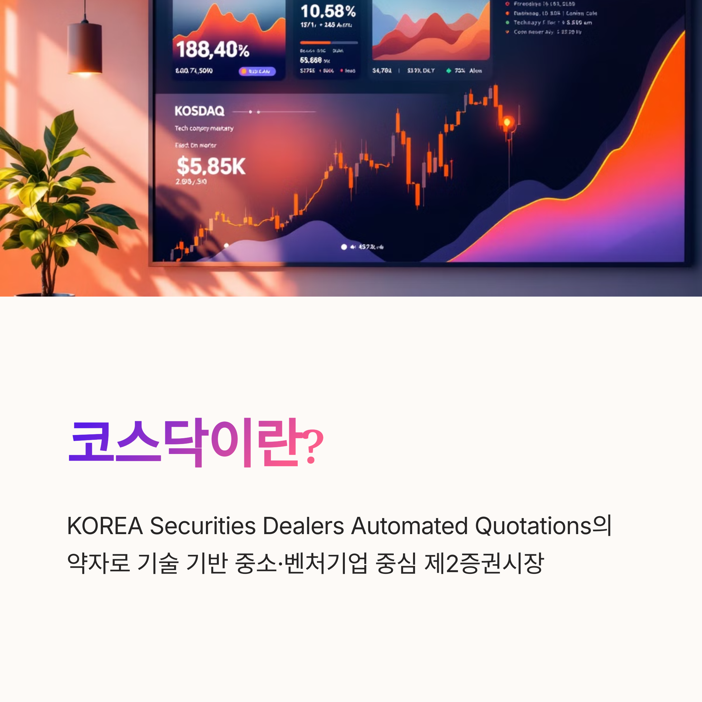 코스닥(KOREA Securities Dealers Automated Quotations)은 기술 기반 기업과 중소·벤처기업이 주로 상장된 제2증권시장입니다. 코스피보다 규모가 작지만 IT, 바이오, 엔터테인먼트 등 미래 성장 가능성이 높은 기업들로 구성되어 있습니다.