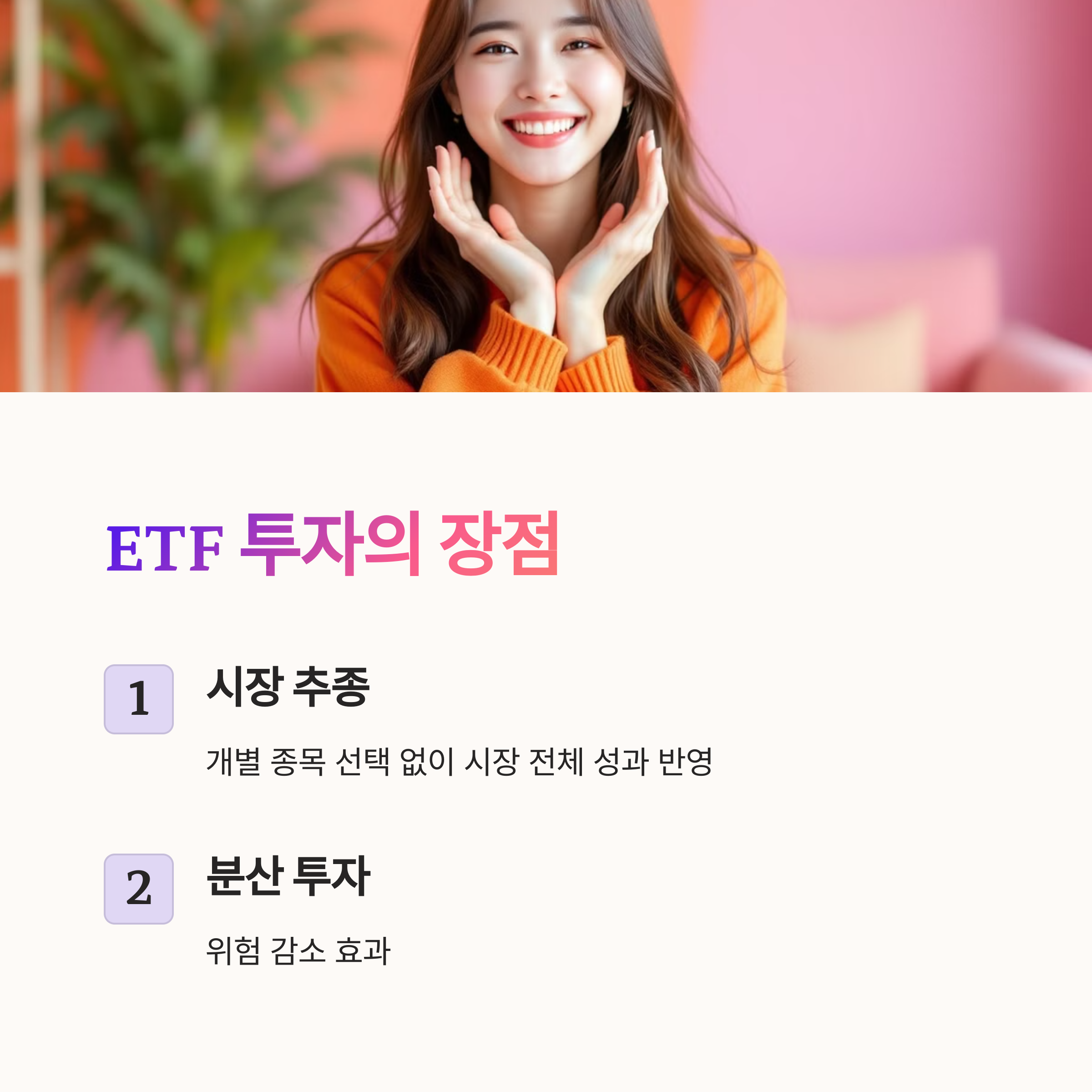 A5. 개별 종목을 직접 선택하지 않고도 시장 전체를 추종하는 효과를 얻을 수 있으며, 분산 투자로 위험을 줄일 수 있습니다.