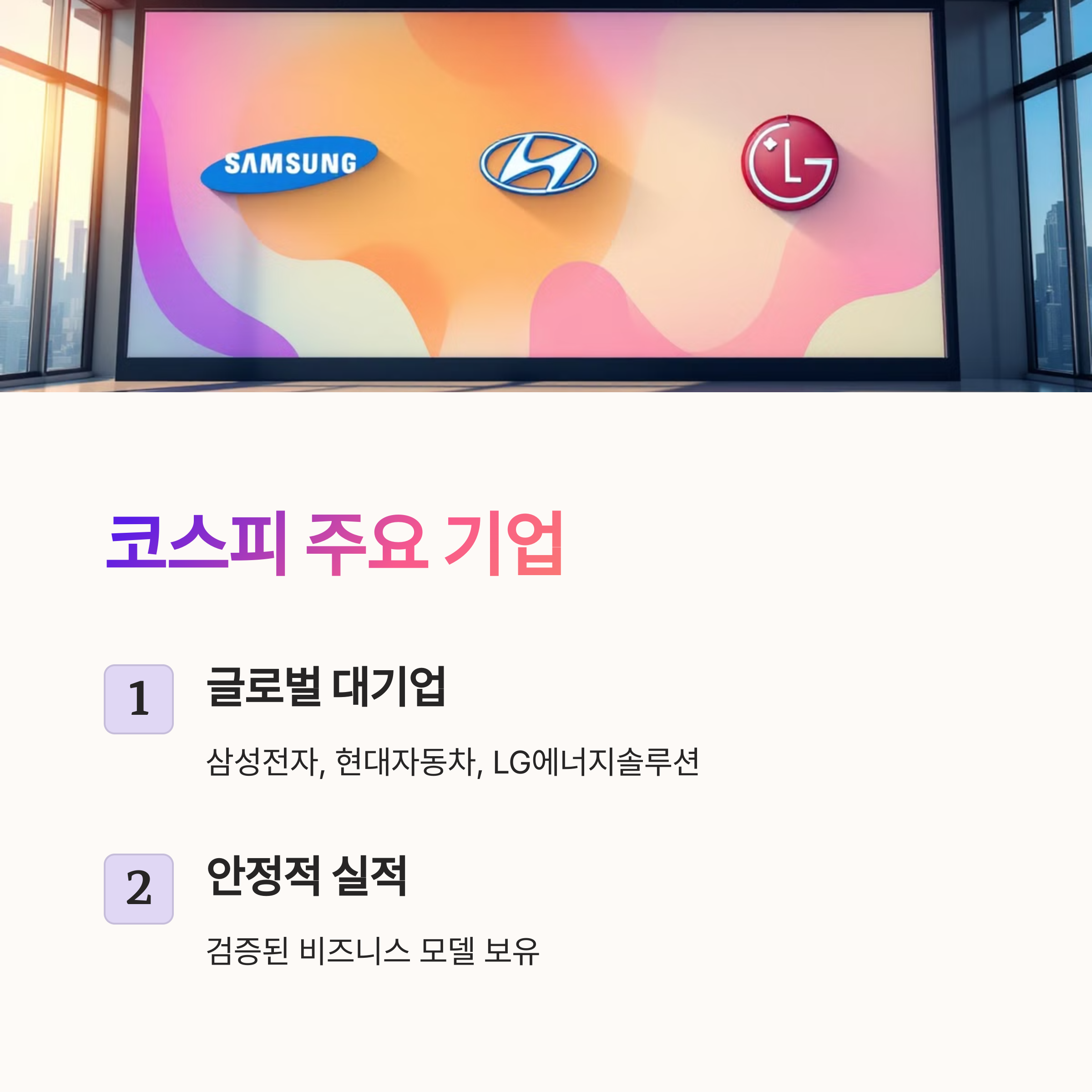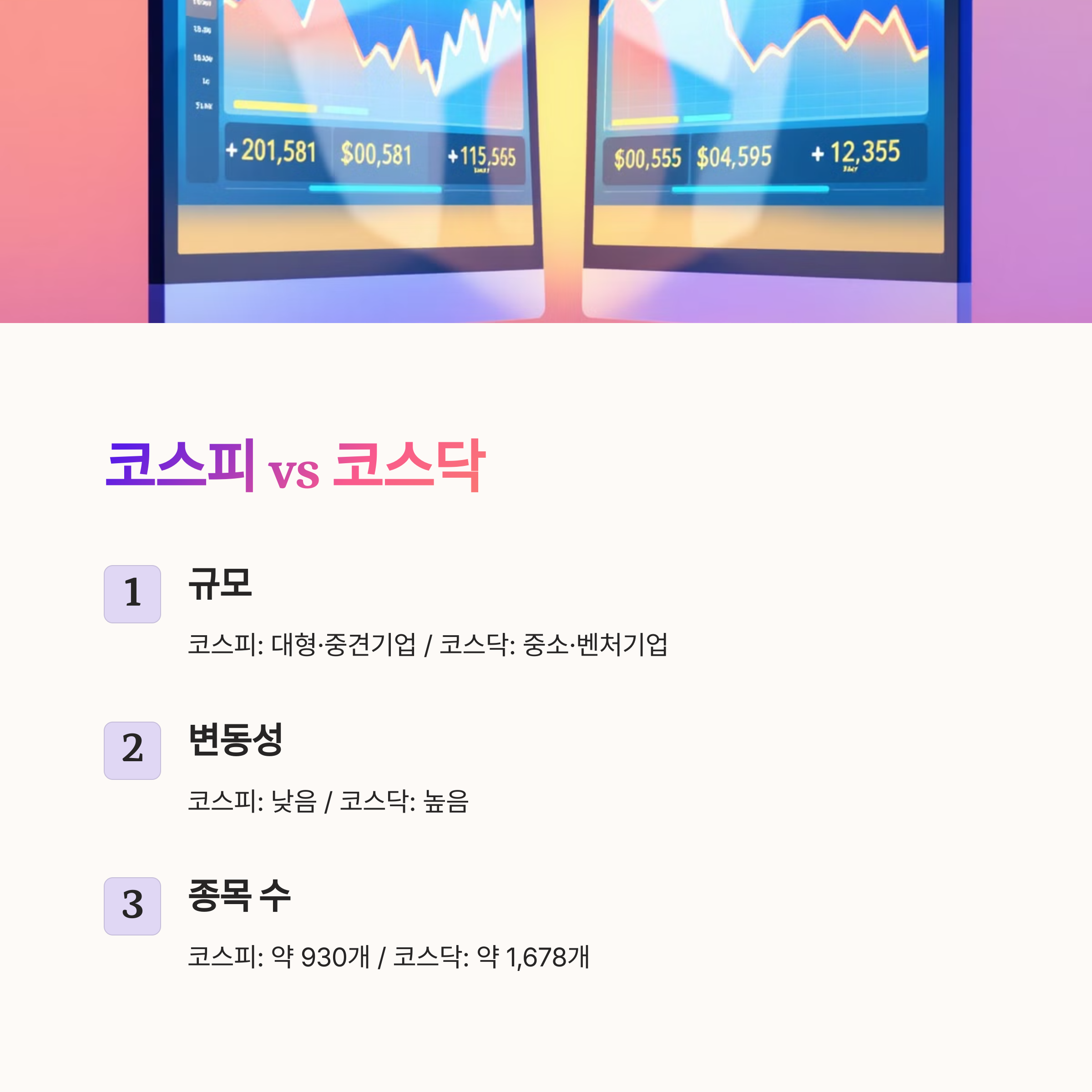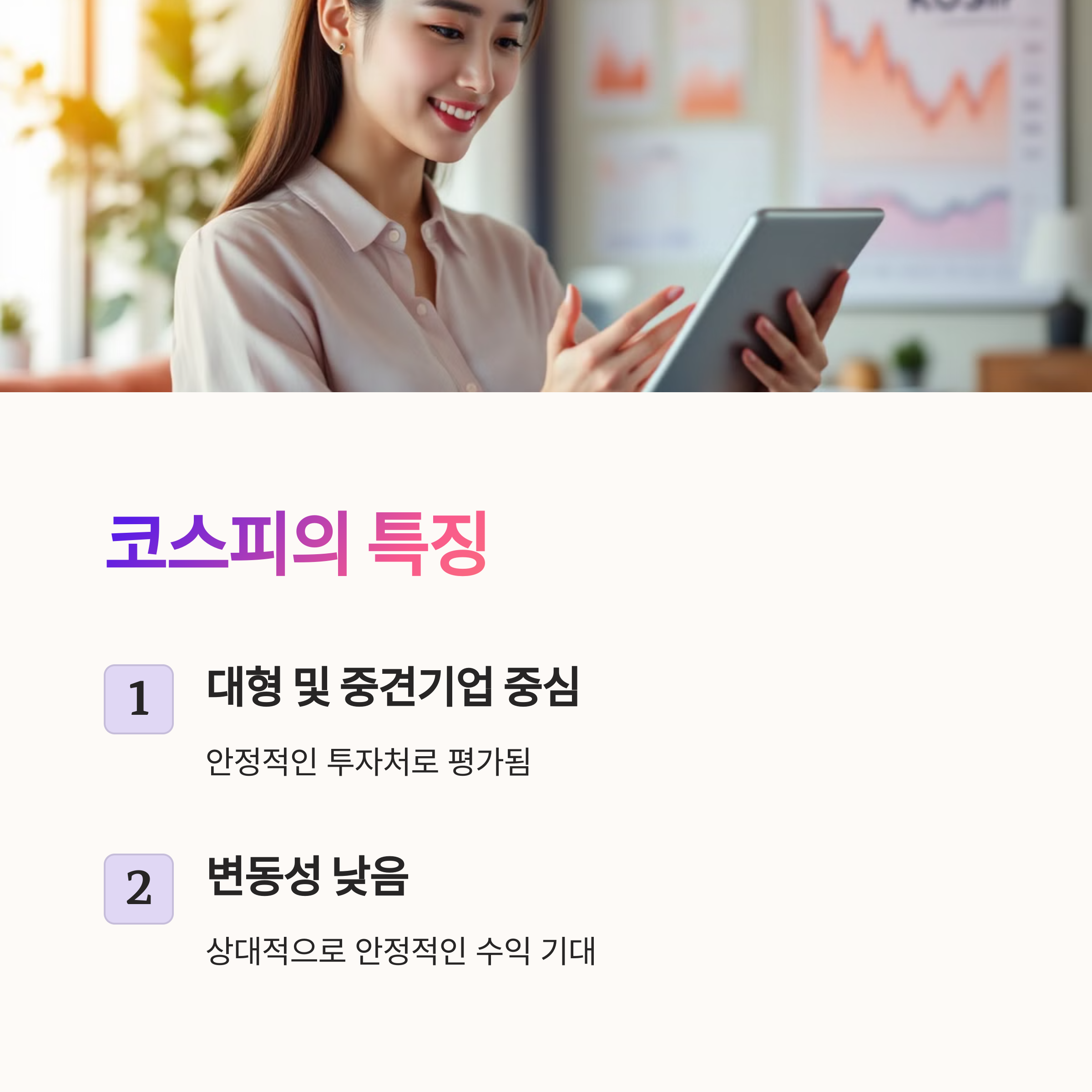 - 코스피: 대기업 및 중견기업 중심의 안정적인 시장
