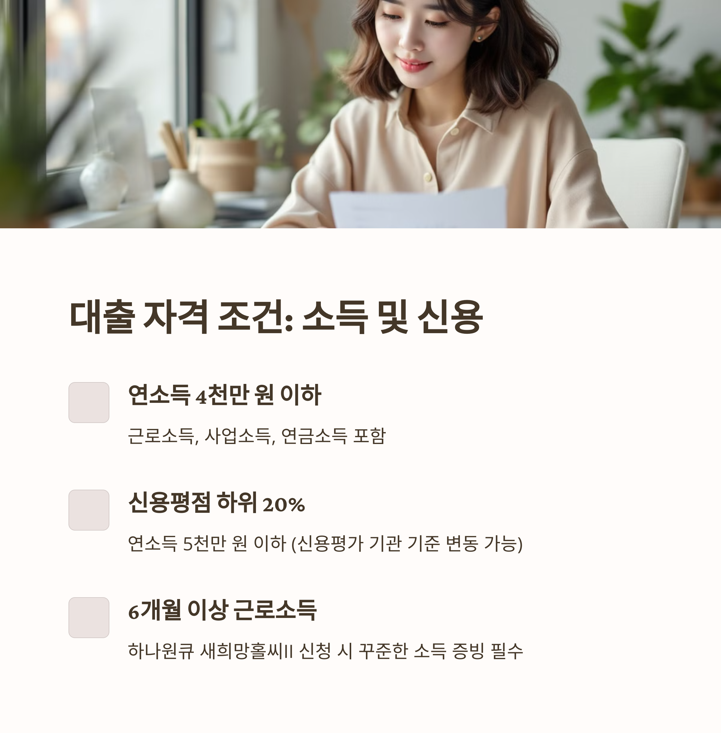 ✔ 신용평점 하위 20% (연소득 5천만 원 이하) : 신용평가 기관 기준 변동 가능