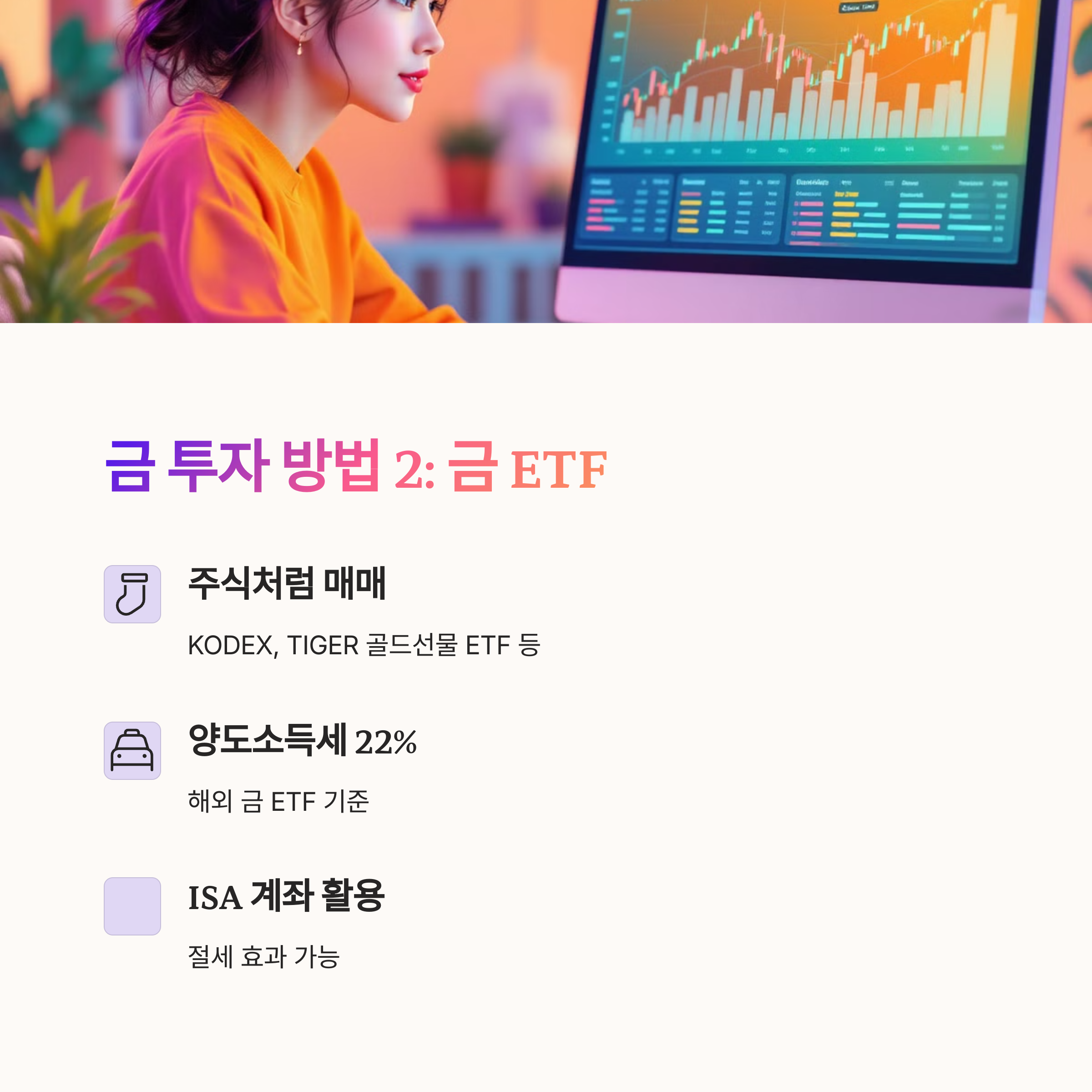 - 부가세 10%가 부과되므로 실물 금보다는 ETF나 골드뱅킹이 유리