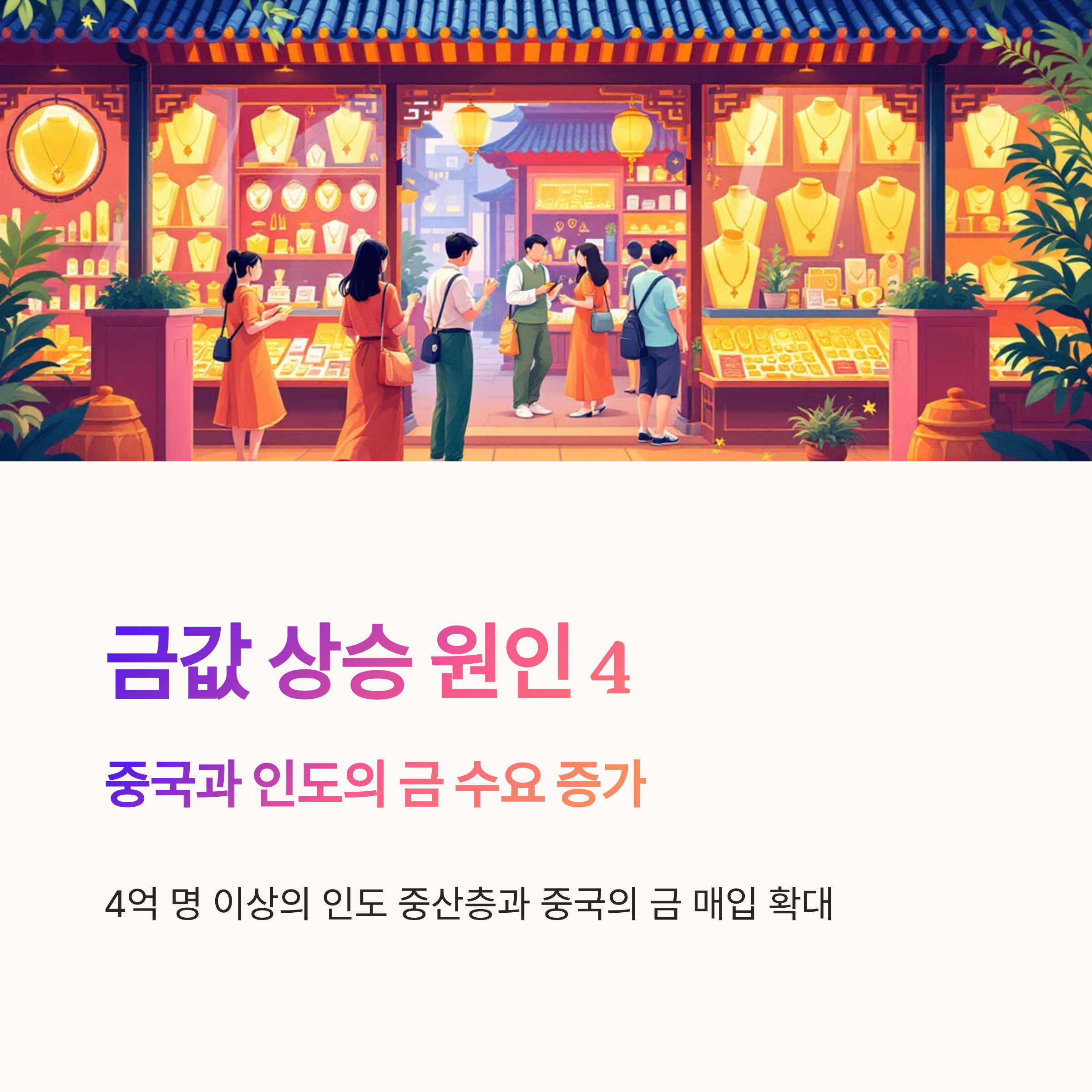 중국과 인도는 전통적으로 금을 선호하는 국가입니다. 특히 인도의 경우 4억 명 이상의 중산층이 있으며, 결혼식과 축제 시즌에 금 수요가 급증하는 경향이 있습니다. 중국 또한 외환보유고 일부를 금으로 전환하며 금 매입을 확대하고 있습니다.