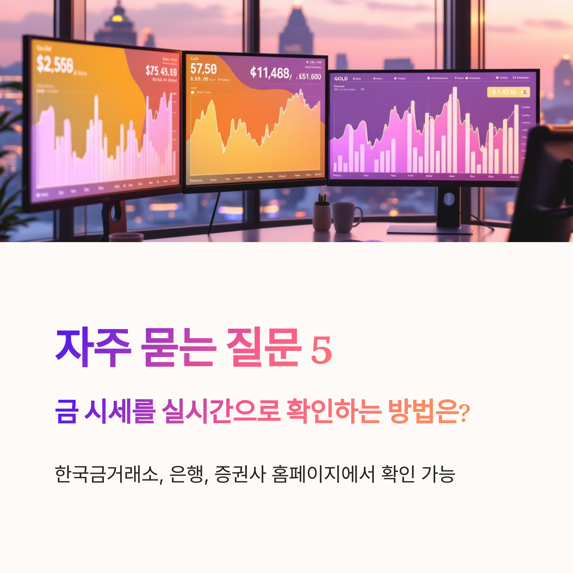 A5. 한국금거래소, 은행, 증권사 홈페이지에서 실시간 금 시세를 확인할 수 있습니다.