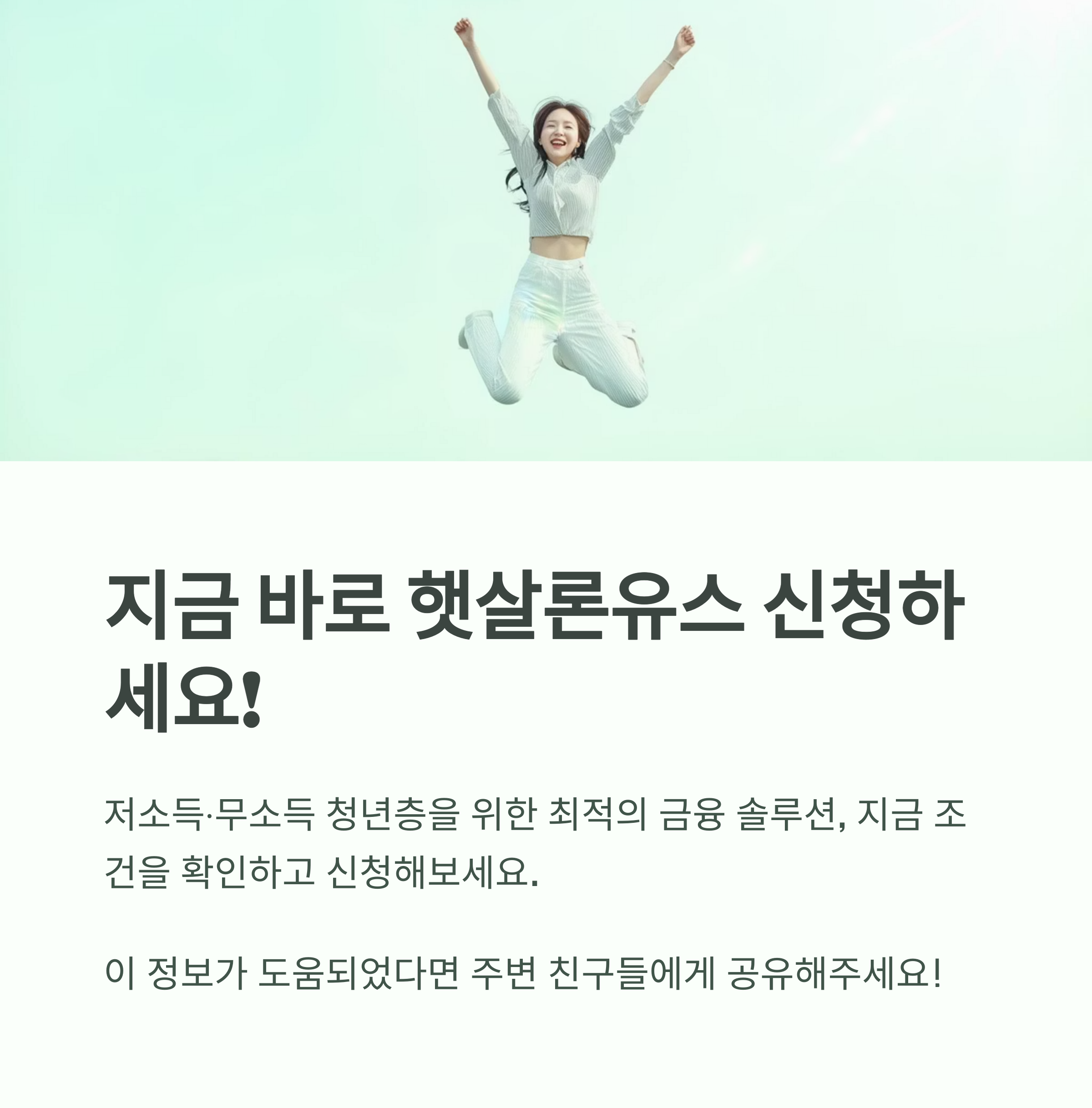 햇살론유스는 저소득·무소득 청년층에게 매우 유용한 정부지원 대출상품입니다. 금리 3.5% 고정이라는 큰 장점과 함께 중도상환수수료가 없어 자유롭게 상환할 수 있고, 최대 1,200만 원까지 자금을 지원받을 수 있어요. 지금 자금이 필요하다면, 조건과 절차를 꼼꼼히 확인하고 지금 바로 햇살론유스를 신청해보세요!
