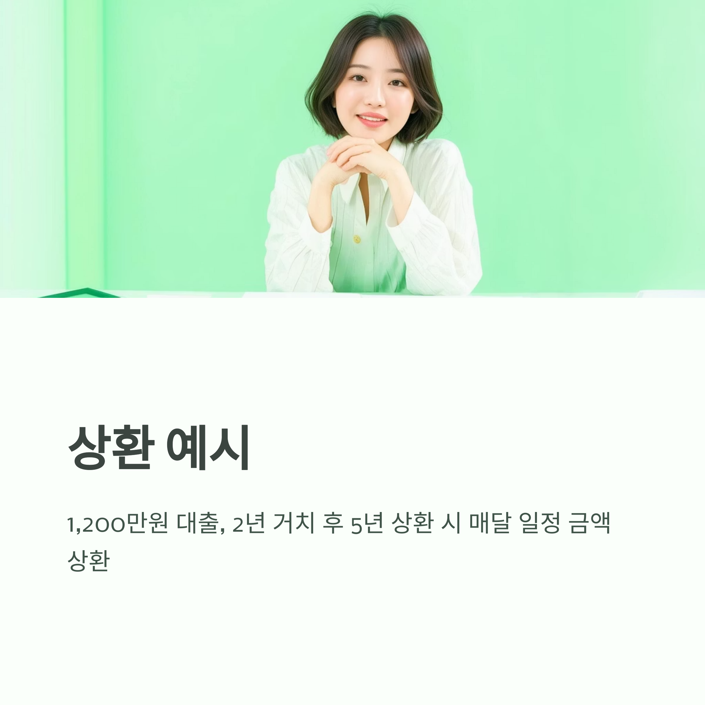 상환 예시: 1,200만 원 대출 시, 2년 거치 후 5년 상환으로 설정하면 매달 일정 금액을 무리 없이 갚을 수 있어요.