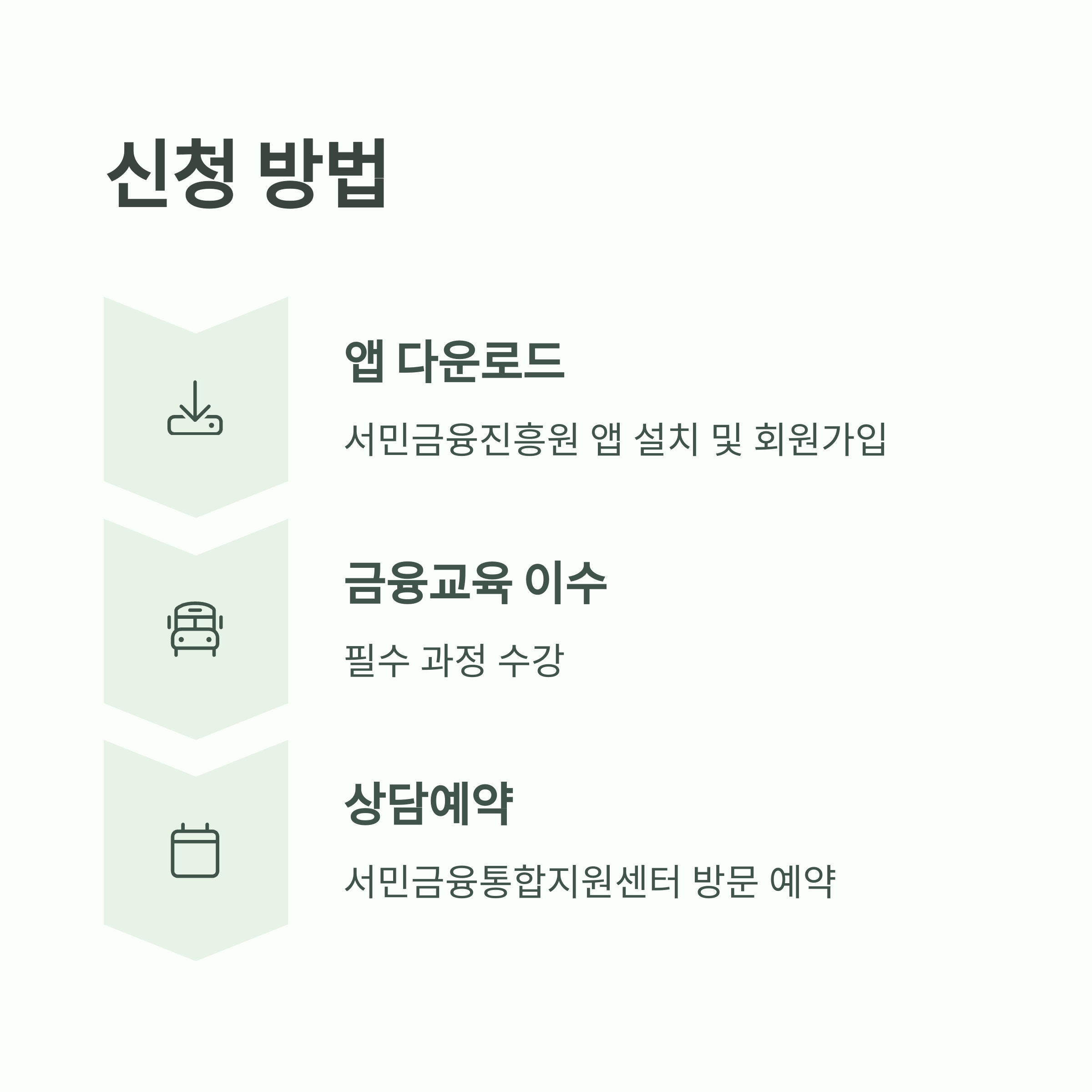 A2. 앱에서 신청 후 상담 예약을 진행하고, 최종적으로 서민금융통합지원센터에 방문하여 심사 기간 동안 절차가 이루어집니다.